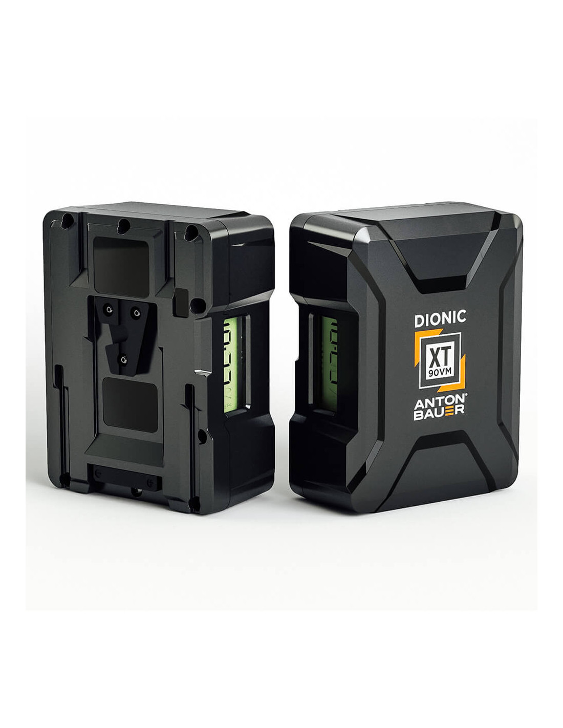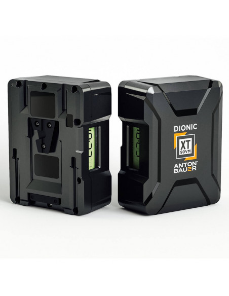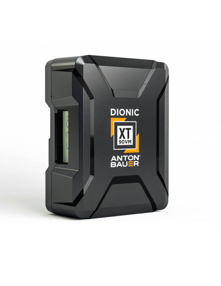 Dionic XT 90 V-Mount Battery V-Mount Lithium Ion Battery, 14.1 volts, 99 Wh The XT series of batteries from Anton Bauer is designed and engineered to give the longest lasting and most reliable Li-ion batteries in their class. With a 12A constant current capability (20A for 2s to deal with inrush on challenging loads) the XT series will power even the most demanding 14.4v cameras and LED fixtures. Each battery comes equipped with a multi-mode backlit display (with touch switch for backlight activation and mode selection) as well as USB and P-Tap power outputs for accessories. Product Highlights 99 Wh capacity >1000 cycle life (flat capacity curve) Backlit Multi-Function Display USB & P-Tap power output 12A constant current (20A for 2 second inrush) Temperature range: -20C to +60C Technical specifications: Range XT Weight 798 g Width 99 mm Height 132 mm Depth 53 mm Mount type V Mount Chemistry Lithium-ion Voltage 14.1 V Capacity 99 Wh Max current 12 Amps Power tap Yes USB Yes Warranty 2 Year