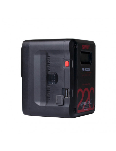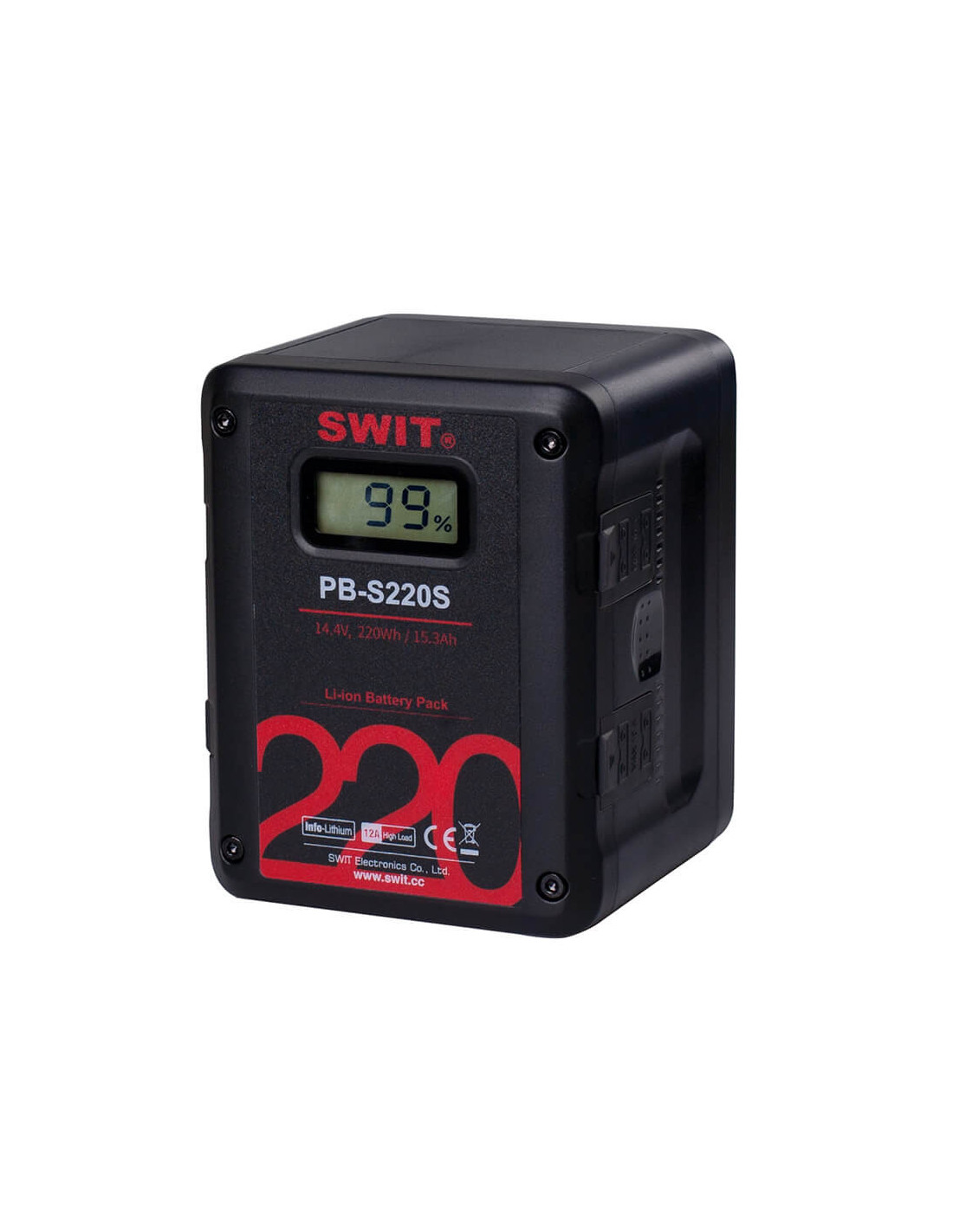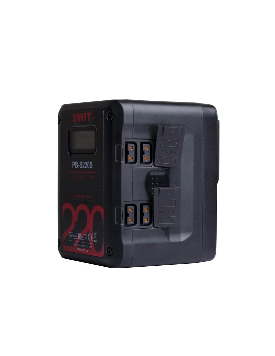 SWIT PB-S220S 14.4V 220Wh The SWIT PB-S220S 14.4V 220Wh Multi D-Tap Heavy-Duty Digital Battery, featuring a V-mount, has a short, square-shaped design and provides up to 150W/12A continuous output. This makes it suitable for up to the most demanding cine-cameras along with monitors and other accessories. With 220 watt hours, the PB-S220S delivers approximately 2.5 hours of power to the ARRI ALEXA and 7 hours to ENG cameras. In addition to this, it offers four D-Tap outputs — meaning you won´t need splitters if you have multiple accessories to power — and a USB port for charging mobile devices. The battery has an intelligent LCD that displays remaining runtime in minutes when the battery is in use and as a percentage value when not in use or when charging. When remaining runtime is less than 15 minutes, the LCD will flash as a warning. It´ll also show a warning signal with a specific warning code if the battery detects over-discharging, over-charging, circuit issues, and the like. A long press of the power-check button will display the battery´s cycle times on the LCD. The PB-S220S also communicates runtime info to RED and Sony viewfinders. This battery also supports fast charging at 6A using the optional SWIT S-3812S charger, which charges 0 to 80% of the battery in 2.3 hours and provides a full charge in 3.5 hours. Specifications: Mount / Series Type V-Mount Chemistry Lithium-Ion Capacity (Wh) 220 Wh Amp-Hours 15.3 Ah Output Voltage 14.4 VDC Maximum Load 150 W, 12 A Accessory Port 4 x D-Tap Maximum Load (Accessory Port) 120 W, 10 A (D-Tap) USB Output 5 V, 2 A Dimensions (W x H x D) 3.74 x 4.76 x 3.78" / 9.5 x 12.1 x 9.6 cm Weight 3.09 lb / 1.4 kg