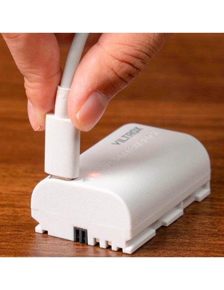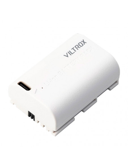 Viltrox TLP E6 USB C battery The Viltrox LP E6 Battery ( LP E6 ) TYPE C 2400MAH for Canon Camera is compatible with the Canon LP E6 lithium ion battery. This battery does not require a separate charger and can be charged directly via the USB C connection. You can charge the battery with a phone charger, power bank or even a regular charger. The LED indicates the battery's charging status. This battery is the same size as the original battery, making it compatible with all cameras, LED lights and external monitors that use a Canon LP E6 battery., USB C connector for charging with a phone charger or directly from a power bank The battery has a capacity of 2400mAh Can be charged in approximately 2.5 hours Compatible with the Canon LP E6 2 year warranty