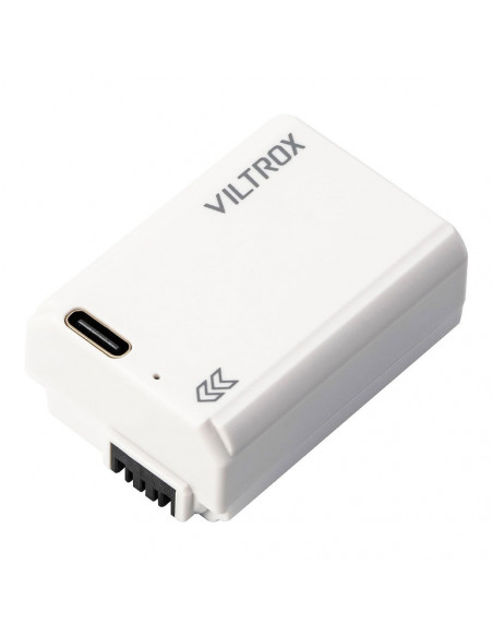 Viltrox TNP FW50 Battery The Viltrox NP FW50 Battery ( NP FW50 ) TYPE C 1030MAH for Sony Camera is compatible with the Sony NP FW50 lithium ion battery. This battery does not require a separate charger but can be charged directly via the USB C connector. You can charge the battery with a phone charger, a power bank or even a regular charger. The LED indicates the charging status of the battery. This battery is the same size as the original battery, making it compatible with all cameras and other devices that use a Sony NP FW50 battery., USB C connector for charging with a phone charger or directly from a power bank The battery has a capacity of 1030mAh Compatible with the Sony NP FW50 2 year warranty