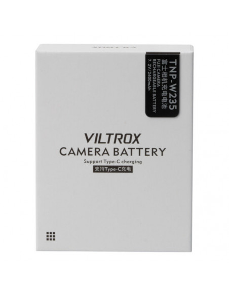 Viltrox NP W235 Battery The Viltrox NP W235 Battery TYPE C 2400MAH for Fuji Camera is compatible with select Fujifilm cameras. This rechargeable battery has a capacity of 2400mAh and a 7.2V output power. You charge the battery in the camera, directly via the USB C port or with an optionally available compatible charger., Compatible with selected Fujifilm cameras Charging time of 2 to 2.5 hours Capacity of 2400mAh 2 year warranty