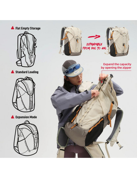 World in Your Pocket The design of the VSGO Pocket Ranger 35 L Off White Green With Insert is inspired by the natural mechanisms of living organisms and cleverly integrates them into the product. Embraces the core philosophy of âNeed to breatheâ, an expression of boundless love for nature and a desire for freedom. Highlights Versatile camera bag Expandable volume: 35L to 43L. Fully open back panel âSnap Opening Systemâ for quick opening and closing. A versatile camera bag This camera bag has a patented folding inner lining that offers an âexpand and contractâ function. When the lining is half filled, the bag transforms into an outdoor photography mode, fitting half photo equipment and half outdoor gear. Fully filled, it becomes a large capacity camera bag. Without the inner lining, it serves as an outdoor bag. When empty, the bag can be compressed to a thickness of just 2 cm, allowing easy storage without taking up space. The Teflon water repellent coating and PVC waterproof adhesive protect the camera well. Fully open back panel The external exoskeleton structure provides strong support and distributes pressure, allowing you to move smoothly through the wilderness even when fully loaded with gear. The fully open back panel allows you to open the bag from any side, both front and back. You can also quickly access your photography equipment through the back panel by placing the custom camera pocket inside the bag. The back panel has excellent support from ultra light aluminium alloy, which keeps its shape regardless of the load. Patented opening system The Pocket Ranger's innovative patented technology, the âSnap Opening Systemâ, offers a new and fast way of opening and closing. The German Fidlock magnetic quick release buckle allows the backpack's zip to be quickly opened and closed by pulling the cord, making it easy to access food during a hike or equipment during a climb. This unique locking mechanism not only facilitates finding and organising gear, but also adds an element of fun to its use. One bag for multiple purposes The interior is freely customisable to suit your needs, allowing you to choose different loading modes. Perfect for photography, hiking, camping and travelling. With a unique expansion system: 25 litres can be expanded to 33 litres and 35 litres can be expanded to 43 litres., Compact to store (compressible to 2 cm thick). Teflon water repellent coating and PVC waterproof adhesive Exoskeleton structure for strong support and pressure distribution Access from any side (front and back) thanks to open back panel Back panel with ultra light aluminium alloy for shape retention regardless of load âSnap Opening Systemâ for quick opening and closing. German Fidlock magnetic buckle with quick release closure. Easy access to gear during hiking or climbing. Unique mechanism that combines ease of use with fun. Customisable interior for different loading modes. Expandable volume: 35L to 43L. Dimensions: 59 x 31 x 20 cm Weight backpack: 1690 g Pouch weight: 670 g 2 year warranty