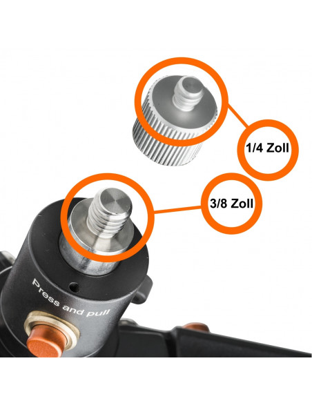 The built-in ball head with the sophisticated adjustment mechanism allows stepless adjustment or positioning of your equipment and can be firmly locked. The ball head accommodates equipment and devices with 3/8 inch thread and the supplied adapter reduces this 3/8 inch thread to 1/4 inch. Thus, you are perfectly equipped and prepared for every situation and piece of equipment.