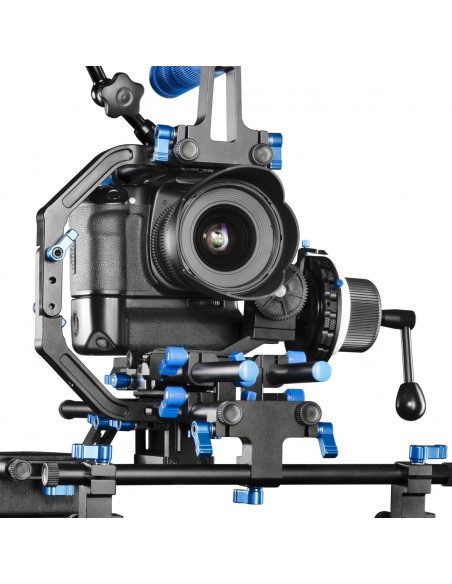 The walimex pro Double Clamp Block for video rigs serves the purpose of compensating for the difference in height between rig and lens. With the help of this clamping block another pair of rods can be attached to the rig for mounting accessories like e.g. a Matte Box. Since cameras with aperture battery grips are too high for the ideal attachment of accessories, the clamping block is the optimal solution for compensation. It can be used to match a vast number of camera/lens combinations. You find the separately available rods listed under accessories