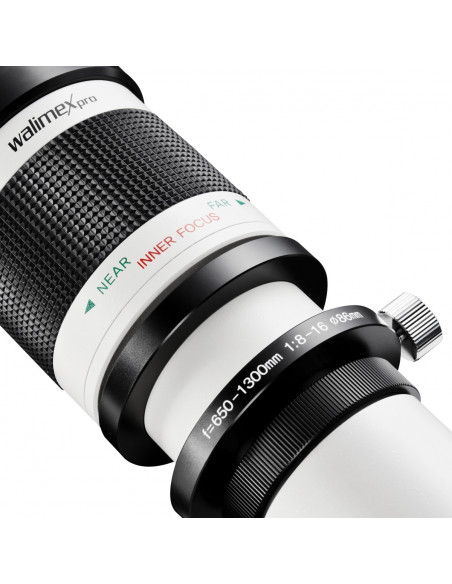 The walimex pro Telezoom Lens has an unusually long focal distance range of 650-1300mm at a speed of 1:8.0-16 (depending on focal distance). The sturdy metal casing and the high-quality coated glass lenses ensure a good image quality. The internal focusing (i.e. the front lens does not turn while focusing) enables the unproblematic use of polarising and graduated filters. With the help of the sturdy tripod mount ring the lens can be fastened to a tripod with an optimised balance point (because of the long focal distance we recommend the use of a tripod in order to achieve vibration-free exposure). With a comparatively short closest focusing distance of only 5 metres, the lens enables a sensational magnification at 1300mm. Focusing takes place manually. The lens can be used with aperture priority and manual exposure setting. Thanks to the easy handling, the lens is also especially suitable for beginners.