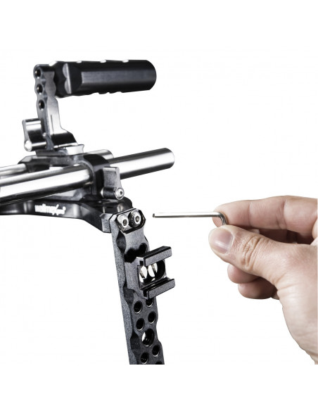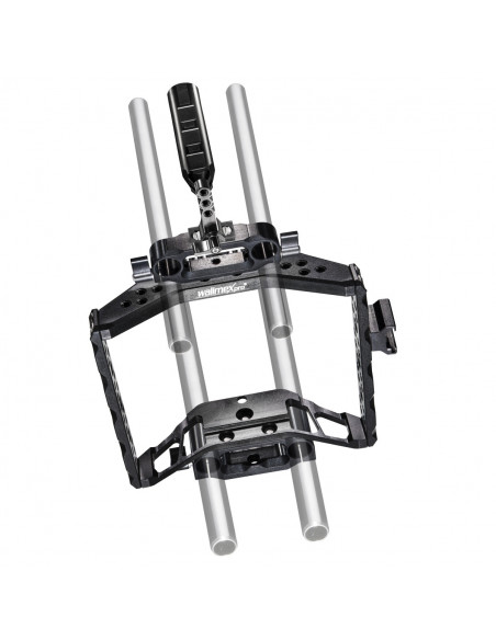 Thanks to a large number of 1/4-inch threads around the cage, any number of accessories such as a microphone, monitor or LED light can be attached as required. A special highlight are the rod modules already mounted above and below the cage. You can attach accessories such as Follow Focus and Mattebox directly to the 250 mm long rods (15 mm light weight support Industry Standard LWS) and are therefore particularly flexible in use. Of course, the stainless steel rods can also be unscrewed at any time. For use on a tripod, the lower rod module features a sturdy, particularly resilient 3/8 inch tripod thread. Additional flexibility in use is provided by the adjustable handle, which can be mounted at the top, bottom or side as required. This also allows filming close to the ground. In any case, access to the battery compartment, memory card etc. remains unrestricted.