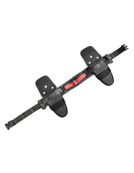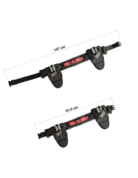A red, elastic safety strap is attached to the camera belt. You can tighten this strap around the camera you currentls don't use and thus secure it against dangling around. It is best to use this function if you will not need the camera for a while. The red safety belt has two ring carabiners that you can use to attach it to the 8 D-rings of the belt. The D-rings can also carry other equipment, such as gaffer tape, gloves or anything else that can be fitted with a carabiner.