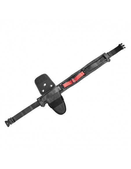 A red, elastic safety strap is attached to the camera belt. You can tighten this strap around the camera and thus secure it against dangling around. It is best to use this function if you will not need the camera for a while. The red safety belt has two ring carabiners that you can use to attach it to the 8 D-rings of the belt. The D-rings can also carry other equipment, such as gaffer tape, gloves or anything else that can be fitted with a carabiner.