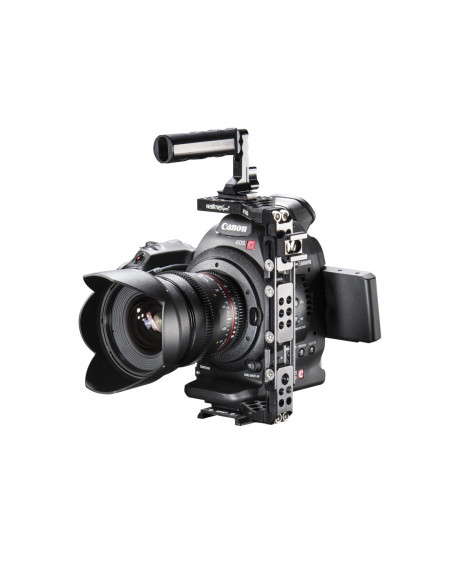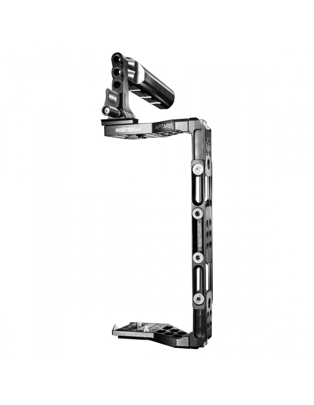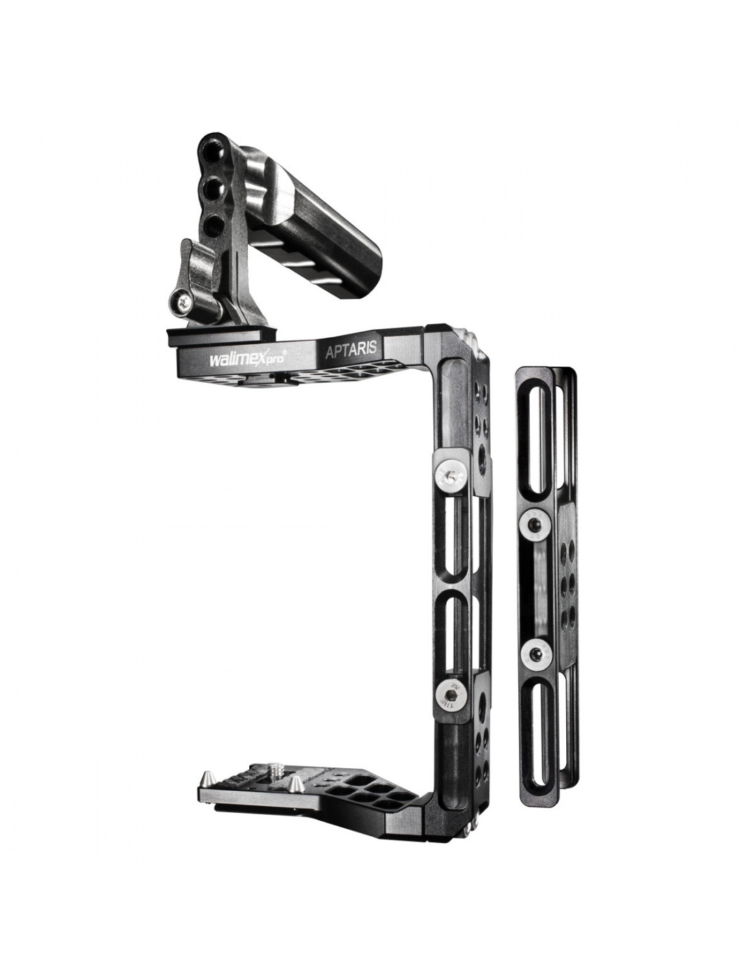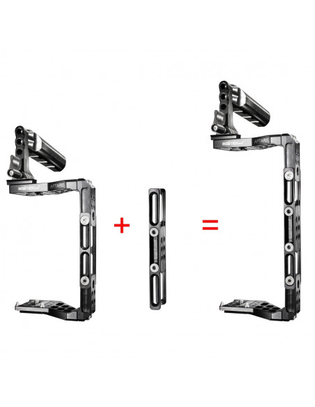 With the help of the Walimex pro Aptaris Universal XXL Adapter, you can extend the height of suitable Aptaris cages such as the Universal XL (#20773) or the Universal Frame (#20984, 2 pieces required) in order to be able to accommodate larger cameras safely. The distance between baseplate and handle module can be freely extended by 50 to 103 mm.