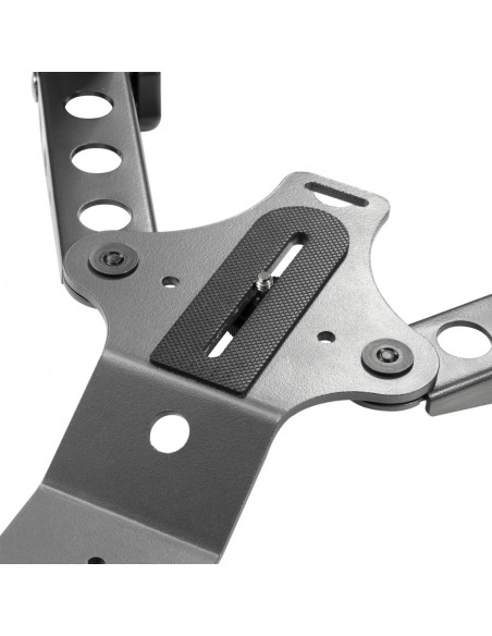 The rig is universally useable and can be adjusted to your individual needs with various joints and a pull-out shoulder pad. It can be pulled out via a telescopic extension. That way you can adjust the rig optimally to your height and work. Each of the joints comes with an internal thread. This allows the fixation of accessories such as, e.g., an external monitor for better judgment of the recording and sharpness, of video lights or an external microphone. The camera plate with a 1/4 inch thread is rubberized and the screw can be moved along the center line. Like this a shifting of the camera body is ruled out and the balance point can be adjusted individually to your camera model, ensuring stress-free working.