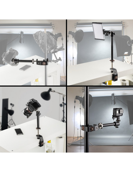 Whether camera, LED light, flash system or compact flash, microphone, smartphone or ActionCam - with the Walimex pro KX-20 Stand Clamp your equipment will find the right position everywhere. Due to the universal and very practical construction you will find a secure hold anywhere. This makes this clamp ideal for use on tripods, stands, tubes, tops, doors, tables and many other objects.