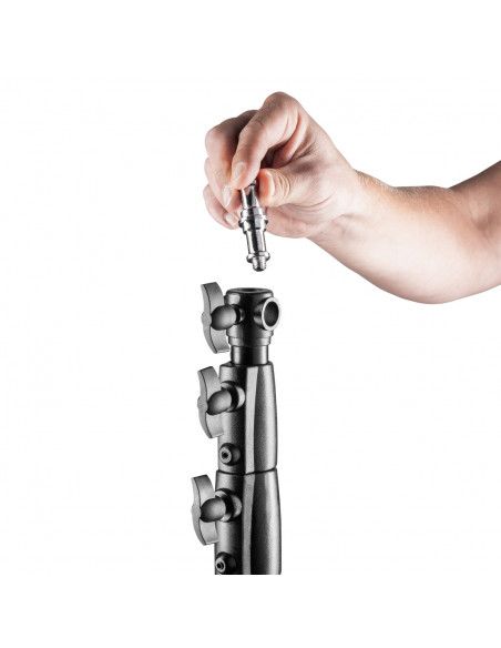 The air damping is the special feature of this stand, as it ensures a high level of comfort and the necessary safety for your equipment when lowering the individual stand sections. The connection adapter is removable and offers the widely used standard 5/8 spigot (16mm spigot) connection with additional 1/4 and 3/8 inch threaded connections. This adapter connection can be used on the top as well as on the side of the head of the stand, so that e.g. booms can also be used. Despite all the convincing stability and high-quality features, the stand only weighs 2,700 grams and is very compact with a transport length of 120 cm. Even the maximum required footprint of Ø 105 cm is still very moderate for a studio tripod in this category.