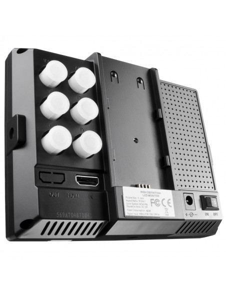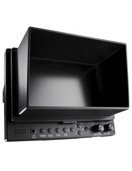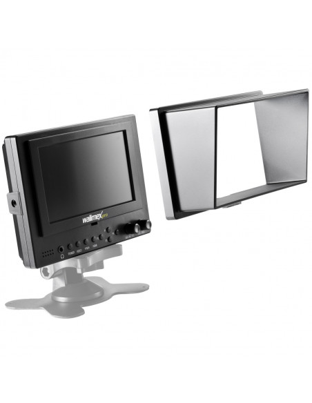 The LCD Monitor by walimex pro facilitates picture control when filming with your DSLR or video camera and therefore makes professional results possible. A sun shade, the high brightness and high contrast ensure an excellent view of the display even in direct sunlight. At a display size of 12.7cm (5 inch) and a resolution of max. 800x480 pixels the monitor shows a clear and detailed picture. It supports the Full HD signal. The large viewing angle also allows several people a view of the monitor. The aspect ratio can be switched from 16:9 to 4:3.