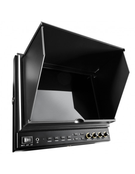 An optional sun shade, the high brightness and high contrast ensure an excellent view of the display even in direct sunlight. At an impressive display size of 24.6cm (9.7 inch) and a resolution of 1024x768 pixels the monitor shows a clear and detailed picture. It supports the Full HD signal. The large viewing angle also allows several people a view of the monitor. Other options such as sharpness, contrast, brightness, color saturation, volume and hue can be adjusted as required.