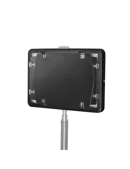 The compact dimensions of 25 x 17 x 3.5 cm and the low weight of just 720 g including light flaps make it easy to carry and set up this floodlight. The light has a total of three 1/4-inch connector sockets on the lower end and on the sides of the housing. The light can, therefore, be used in either portrait or landscape mode. With the supplied tripod mount with 1/4-inch connector, this floodlight can be secured to a lamp tripod and angled. For even more flexibility, a grip is also provided with which you can light your subject separately.