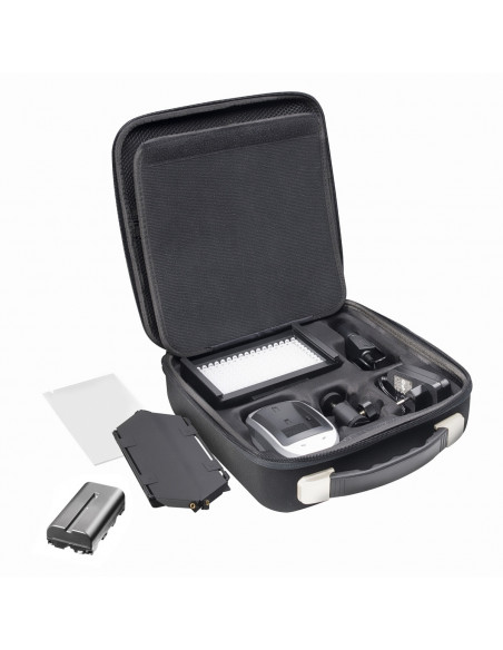 - 1x walimex pro LED Square 170 Bi Color with barn doors, 1x F550 battery, 1x charger with power supply, 1x car charger power supply, 1x ball head, 1x soft diffuser, 1x carry case