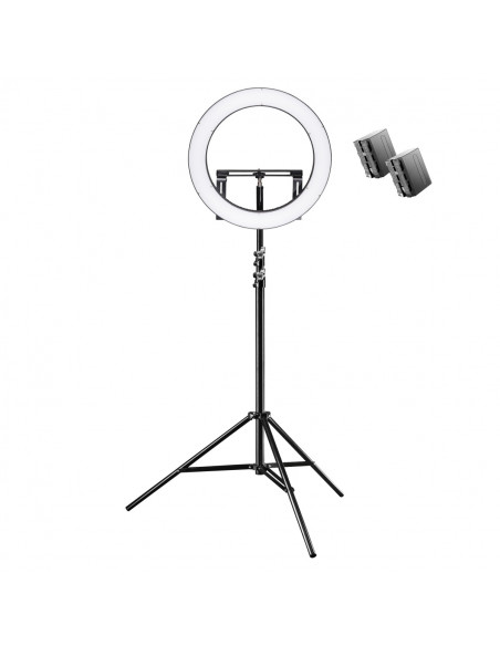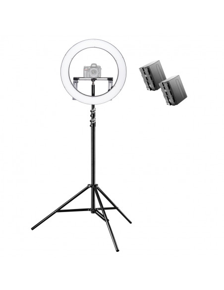 Set of Walimex pro LED ring lamp 500 and matching Walimex pro WT-806 lamp stand plus two rechargeable NP-F batteries