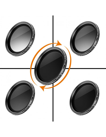 Additional filters can be attached to the ND variable density filter. Due to its design, the variable density filter has a 58 mm thread on the lens side and a thread on the outer side for further filters with a diameter of 67 mm.