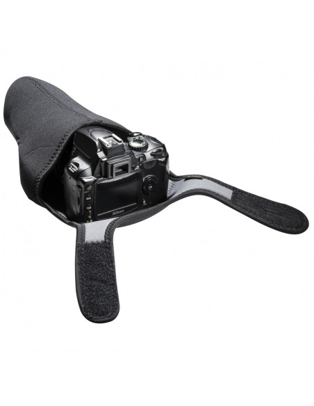 The walimex Camera Protection Cover in size M can be used quick and uncomplicated. Simply putted over your camera and closed with the Velcro fastener, you camera is protected against splash water, scratches and dust within seconds. As cuddly the Neoprene Cover is to your camera as cuddly is also the appearance to your liking: Because with the double-sided usable Cover you can use either the black or the grey side according to your taste. Due to the size of 18x14x12cm, the Neoprene Cover is suitable for medium SLR cameras with mounted lens.