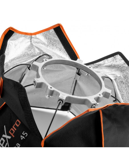 The Octagon Softboxes out of the Orange Line series from walimex pro particularly impress through their unique, high-grade quality. Extremely thick material and exact workmanship guarantee a long life time even after several assemblies and disassemblies. This premium quality even avoids a deformation at the bigger softbox sizes.