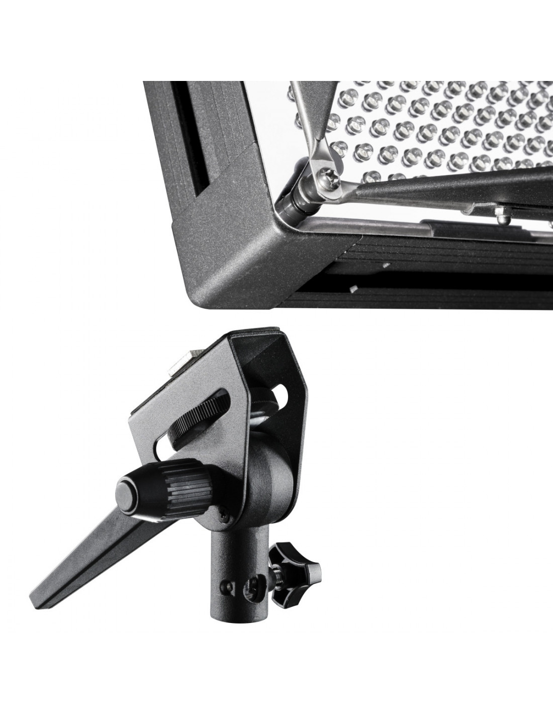 The tripod adapter can be mounted to the panel light on all four sides, so it can be used both vertically and horizontally and therefore be adapted perfectly to the shape of your motif. The tripod adapter and therefore also the light can be adjusted in its longitudinal direction. The tripod adapter can be tilted which allows you to set the direction of the light, a higher located light direction is possible as well like this. Due to the 5/8 inch spigot, you can mount the light on all commercially available lamp tripods.