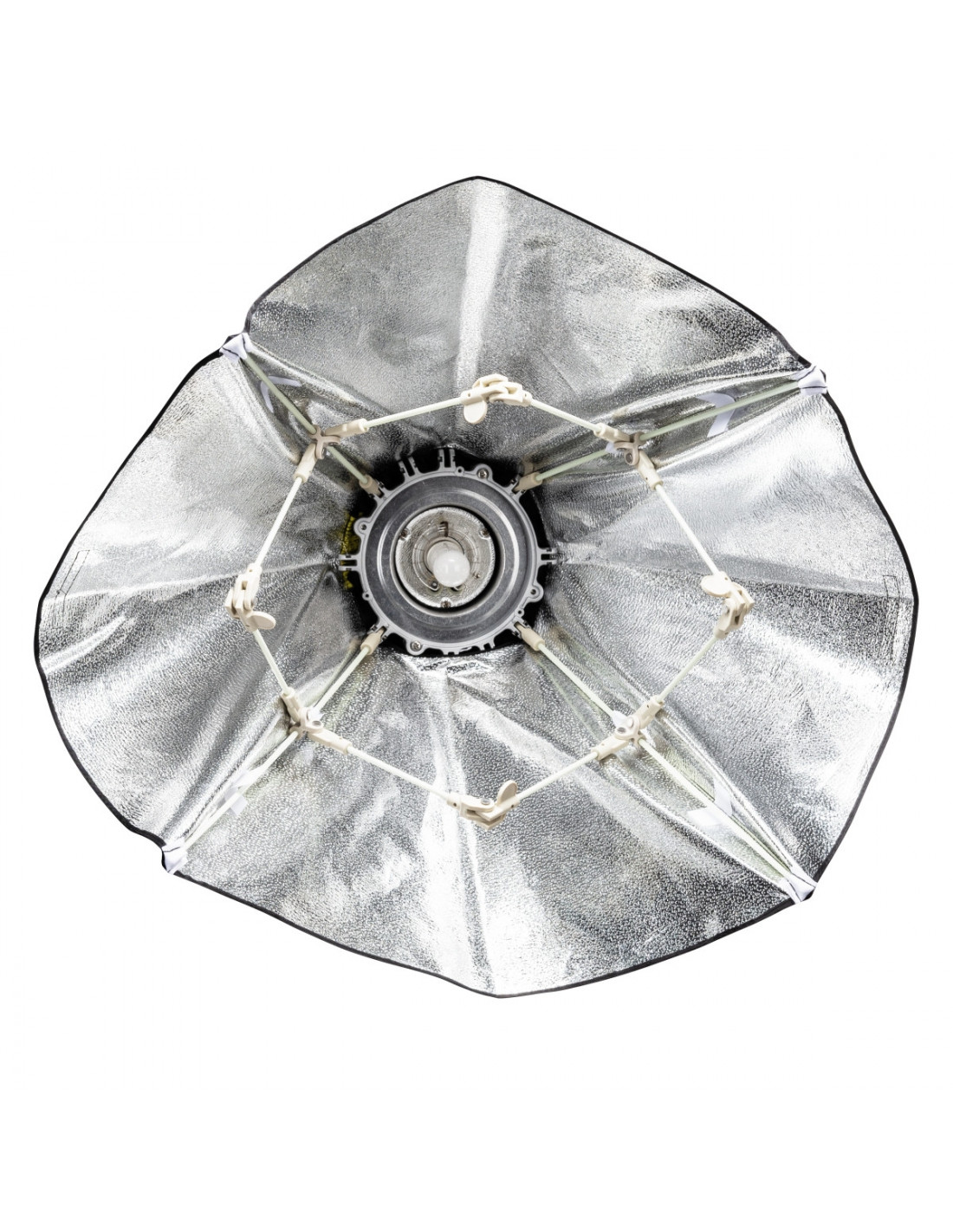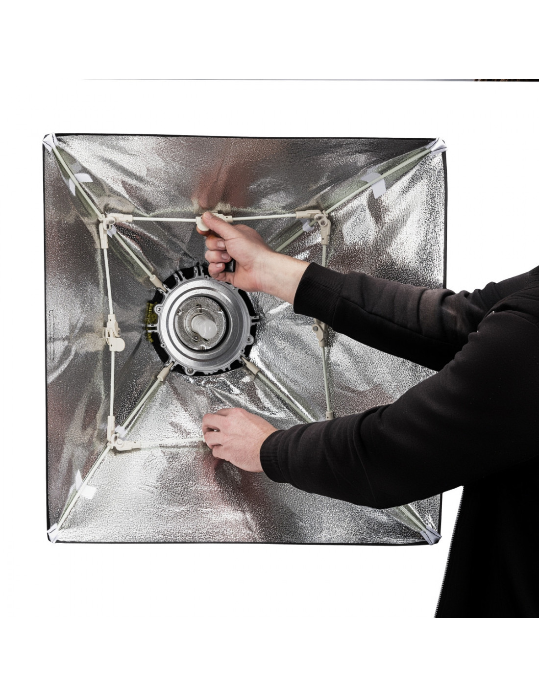An absolute highlight of this Softbox is an innovative folding mechanism, which enables you to set up and use the Softbox in hardly no time at all and without the use of great force. This is obviously highly convenient, if you frequently have to change location during shooting sessions. The inside diffuser is simply attached by a velcro fastener, the outside diffuser can be directly put over it, so that the light can be controlled even easier. When not in use, the Softbox can be strapped down with a belt for space saving stowage.