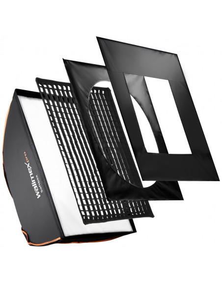 - 1x walimex pro Softbox PLUS Orange Line 75x150, incl. softbox, rods, back diffuser, front diffuser, round mask, square mask, grid and transport bag