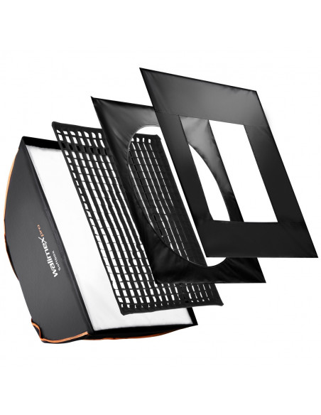 - 1x walimex pro Softbox PLUS Orange Line 80x120, incl. softbox, rods, back diffuser, front diffuser, round mask, square mask, grid and transport bag