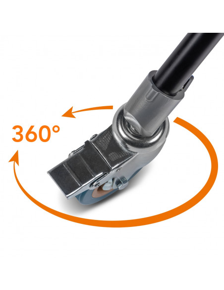 Rolling stands make work in the studio and on location much easier. Move camera, light, flash, diffusers, reflectors and other equipment with sensational ease. Each castor features its own step-lock brake that can be operated with the foot. Due to the large diameter of the castors of 75 mm, they can also be moved well on uneven surfaces such as outdoors on gravel or grass. They are thus ideally suited to reliably carry heavy loads. ball bearing ensures smooth running, while the abrasion-resistant rubber coating of the castors ensures smooth running and a secure footing.