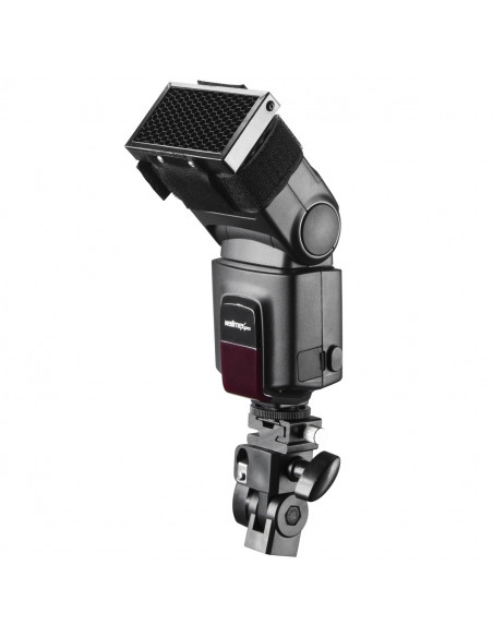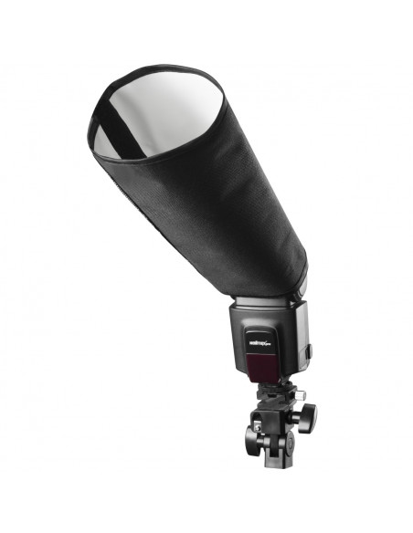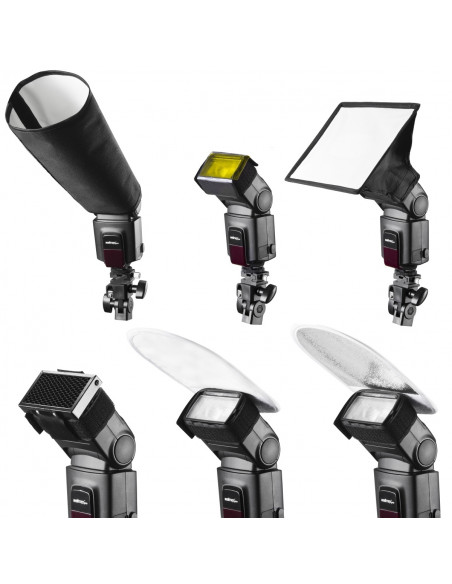 The softbox ensures a soft and even illumination. With the different colored filters you can achieve various color effects and change the color temperature. The light shaper and the honeycomb make a precise direction of light possible. The reflector reflects the light of the flash and therefore makes indirect flashing possible.