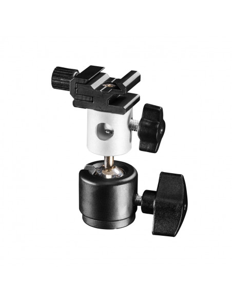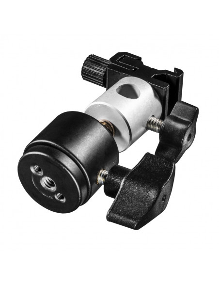 The umbrella and hot shoe holder with ball head has a 1/4-inch thread underneath into which, for example, a spigot adapter can be screwed. On the head piece of the adapter, there is an umbrella mount for umbrella part with a maximum diameter of 10 mm and a flash hot shoe mount that can take any usual system flash.