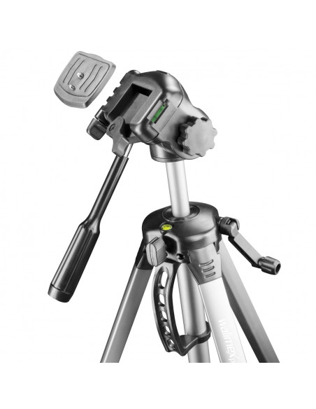 The Walimex pro WT-3530 tripod is equipped with a permanently installed 3D-Panhead, which allows a precise alignment via a spirit level on the head and a bubble level on the tripod shoulder. The max. load is 3 kg and your equipment can be easily and quickly mounted with a quick release plate with an included 1/4 inch connection. The quick release plate is very generous with 65x52 mm and thanks to a practical locking lever in a matter of seconds dissolved or attached. Very useful in practice and certainly not a matter of course for starter tripods - additional quick release plates for the WT-3530 can be purchased separately (walimex No. 15129 (65mm) and 13824 (75mm)).