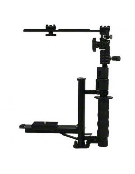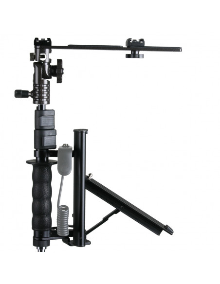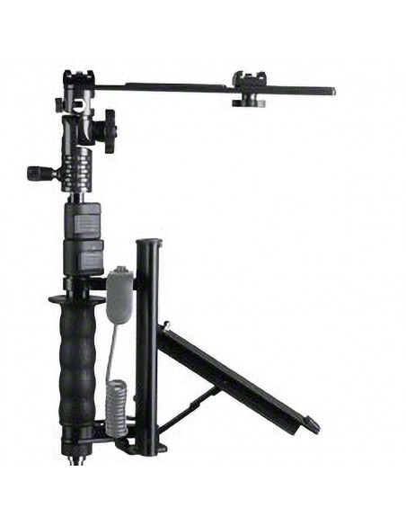 Through this Flip Flash Bracket, the distance between flash device and lens will be increased and therewith the red-eye effect reduced to a minimum. A better illumination of indoor photos and through this a better picture quality is the result of this bracket. Your camera is always fixed securely and portrait format photographies can be realized without problems. Your equipment can be used in an optimal way. Extra advantage: Through the telescopic technique, the Flash Bracket can also be variable used in height.