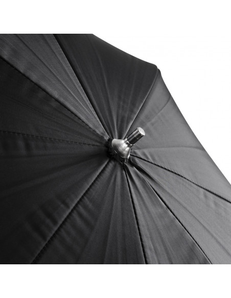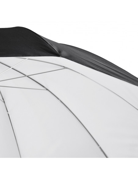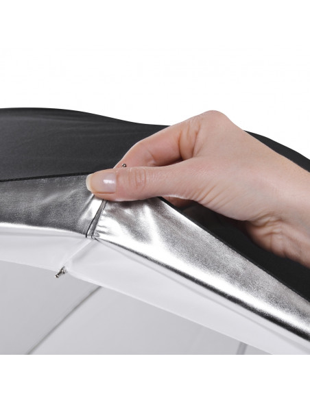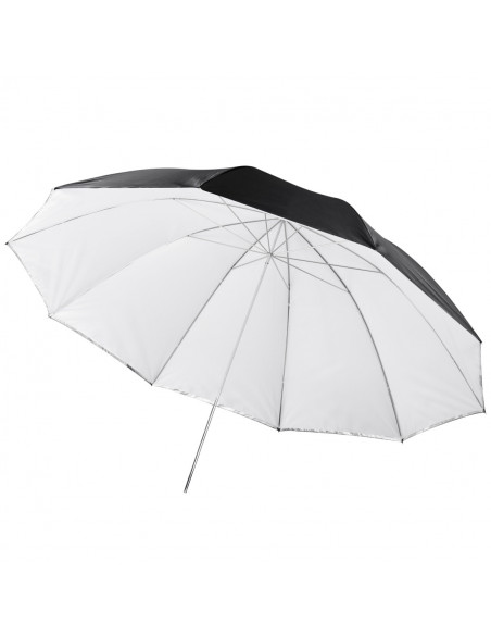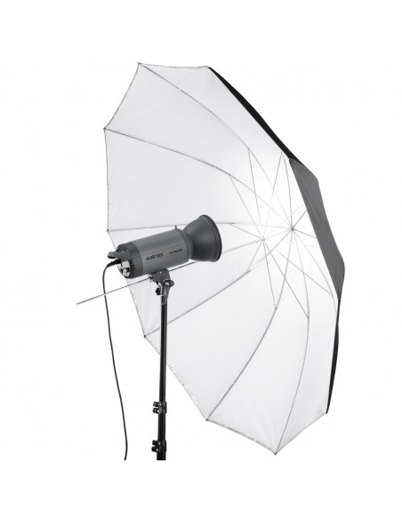 This umbrella by walimex is particularly convenient, as it is reflex umbrella and translucent umbrella at the same time. It consists of two layers, the outer reflex layer, which is coated silver on the inside and black on the outside, and the inner white translucent layer. In order to turn the umbrella from a reflex umbrella into a translucent umbrella, you can simply remove the outer layer.