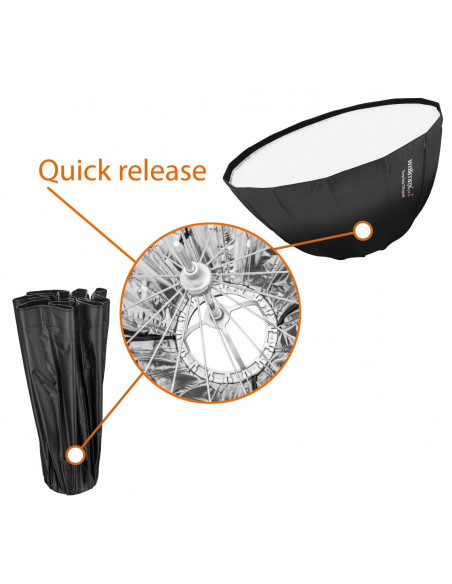 The Deep Rota Softbox can be connected to your flash system or flash heads via a Walimex pro Softbox adapter, which you can purchase separately for all flash systems. The Softbox adapter is then simply placed in the Speed Ring (quick-change bayonet) and fixed with the four screws - and the Deep Rota Softbox is ready for use with your flash head. The Softbox adapter can of course remain mounted for transport in the supplied carrying bag with shoulder strap. Another gimmick: The type of softbox and the size are printed on the various softbox pockets - so the tedious search for the right softbox in the "light shaper store" is finally a thing of the past and you have the right light shaper at hand with a handle.