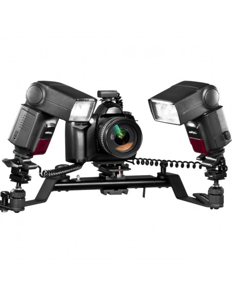 The spiral cable is equipped with a camera hot shoe in the middle and two swiveling hot shoes incl. 1/4 inch thread and 1/4 inch screw on the other side, and is therefore multifunctional in its use. The spiral cable is characterized by its stability, flexibility, and longevity. A little helper that will be much joy to work with. Two panheads ensure that the flash devices can be adjusted in their incline.