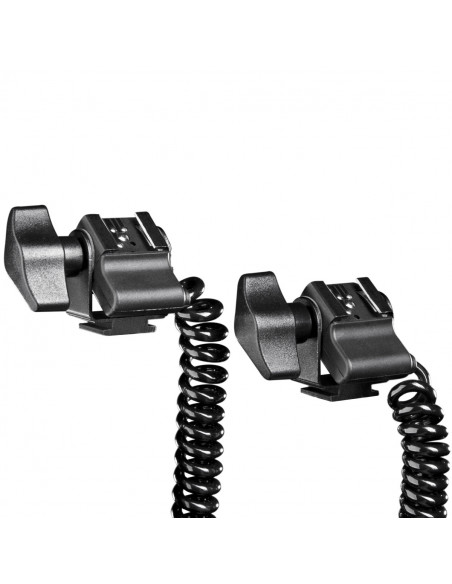 The spiral cable is equipped with a camera hot shoe in the middle and two swiveling hot shoes incl. 1/4 inch thread and 1/4 inch screw on the other side, and is therefore multifunctional in its use. The spiral cable is characterized by its stability, flexibility, and longevity. A little helper that will be much joy to work with. Two panheads ensure that the flash devices can be adjusted in their incline.
