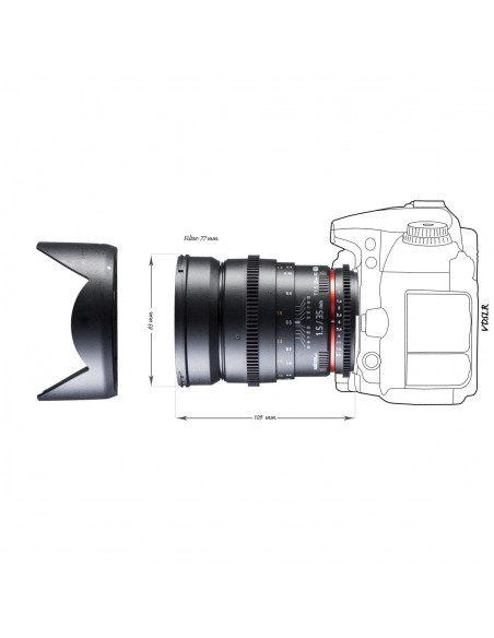This wide angle lens by walimex pro was developed for videography and photography. The f-stop can be adjusted steplessly from 1.5 to 22 and the focus is adjusted softly and runs smoothly. That way a tracking of the focus when filming is possible. The aperture ring and the focus ring come with a tooth ring and are therefore optimized for use with follow focus systems. For better readability, the distance and f-stop scale are displayed sideways.