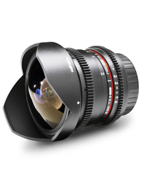 This Fisheye by walimex pro was developed for videography and photography. The f-stop can be adjusted steplessly from 3.8 to 22 and the focus is adjusted softly and runs smoothly. That way a tracking of the focus when filming is possible. The aperture ring and the focus ring come with a tooth ring and are therefore optimized for use with follow focus systems. For better readability, the distance and f-stop scale are displayed sideways.