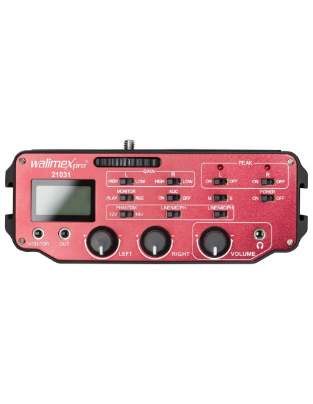The walimex pro audio adapter is a 2 channel XLR adapter with pre-amplifier and phantom power. Ideal of all DSLR cameras with an integrated microphone socket A display shows optical monitoring of the sound recording. There is also a wide range of settings to optimise the sound quality. The audio adapter can be attached simply from below via a 1/4 inch thread to the camera.