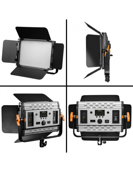 - 2x NP-F battery slots, DMX control sockets and remote control for all functions, incl. 4 barn doors and diffusor pane