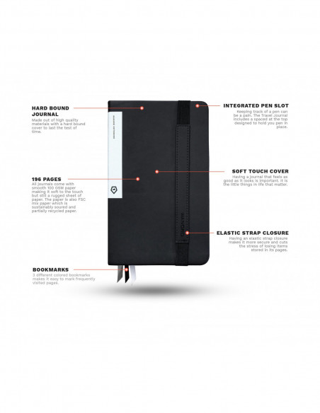 The Wandrd Notebook is a high quality notebook with 196 pages of grid paper. The paper is made from sustainable FSC Mix Paper and has a thickness of 100 gsm. The booklet is bound with a hard cover and features an elastic closing band and an integrated pen holder.