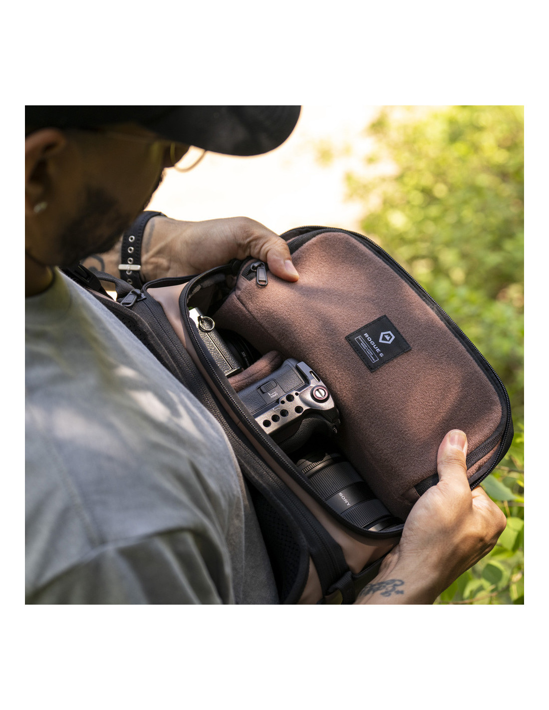 WANDRD ROGUE Sling 6L Rhoone Burgundy V2 og dens større modstykke, 9L, er fleksible arbejdsheste, der ser slanke og eventyrlystne på samme tid. Det har en patenteret udvides bærbar ærme, der kan rumme en MacBook Pro op til 16 inches, hvilket gør det ideelt for kreative fagfolk, der ofte er på farten.