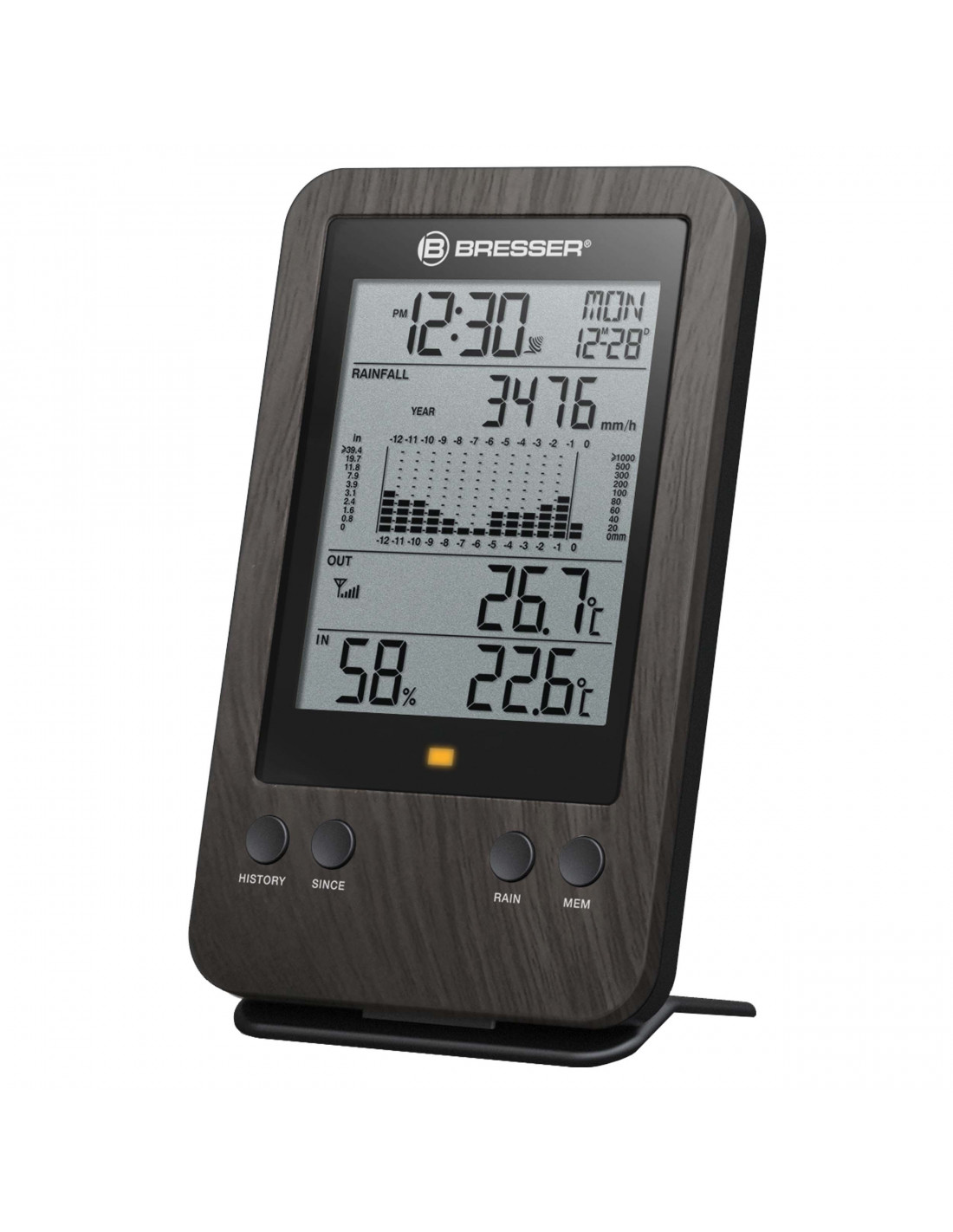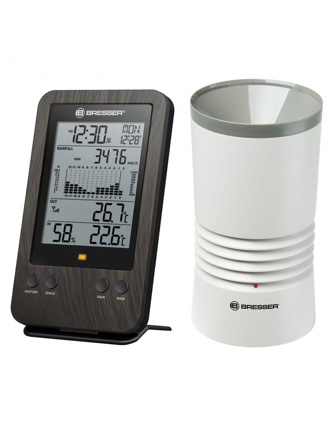 _x000D_ The BRESSER Profiessional rain gauge shows the detailed rain measurement values in millimetres, and also the indoor and outdoor temperature is displayed precisely. The rain gauge has a radio distance of 150m outdoors. The radio range is achieved by the 868 Megahertz radio signal. The base station can determine temperature and humidity and can also show the rain readings hourly, daily, weekly, monthly or annualy. It is equipped with a graphical histogram.