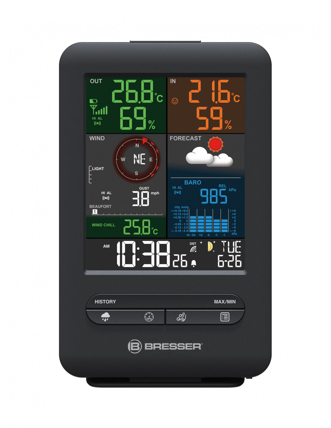 Why purchase an additional base station? The BRESSER 5-in-1 Beaufort Weather Station is ideal for living rooms and hallways. It displays the temperature, humidity, air pressure, wind direction and speed, amount of precipitation and a graphic weather forecast, so that you're always up-to-date with the weather. It also displays the date, day of the week and moon phases.