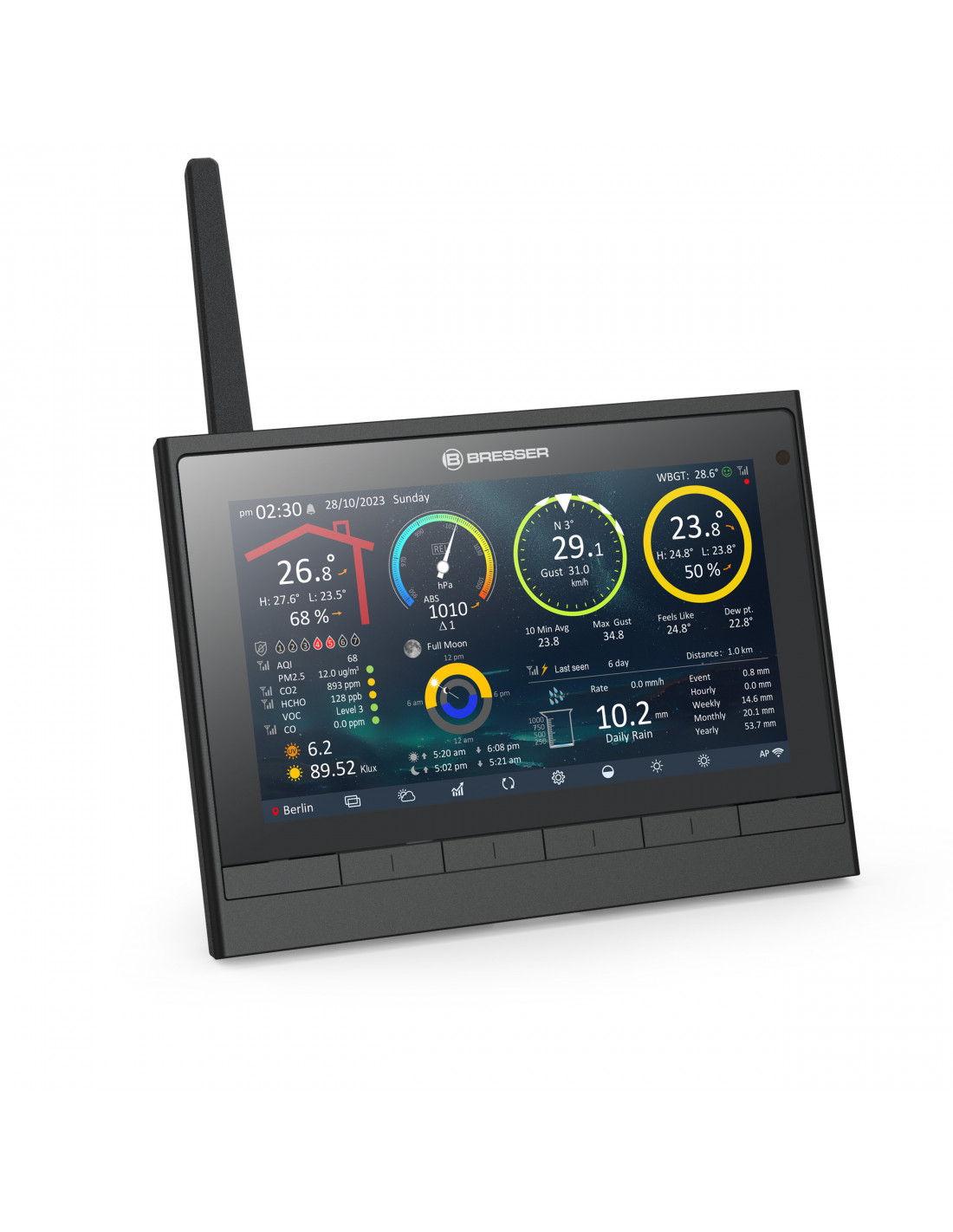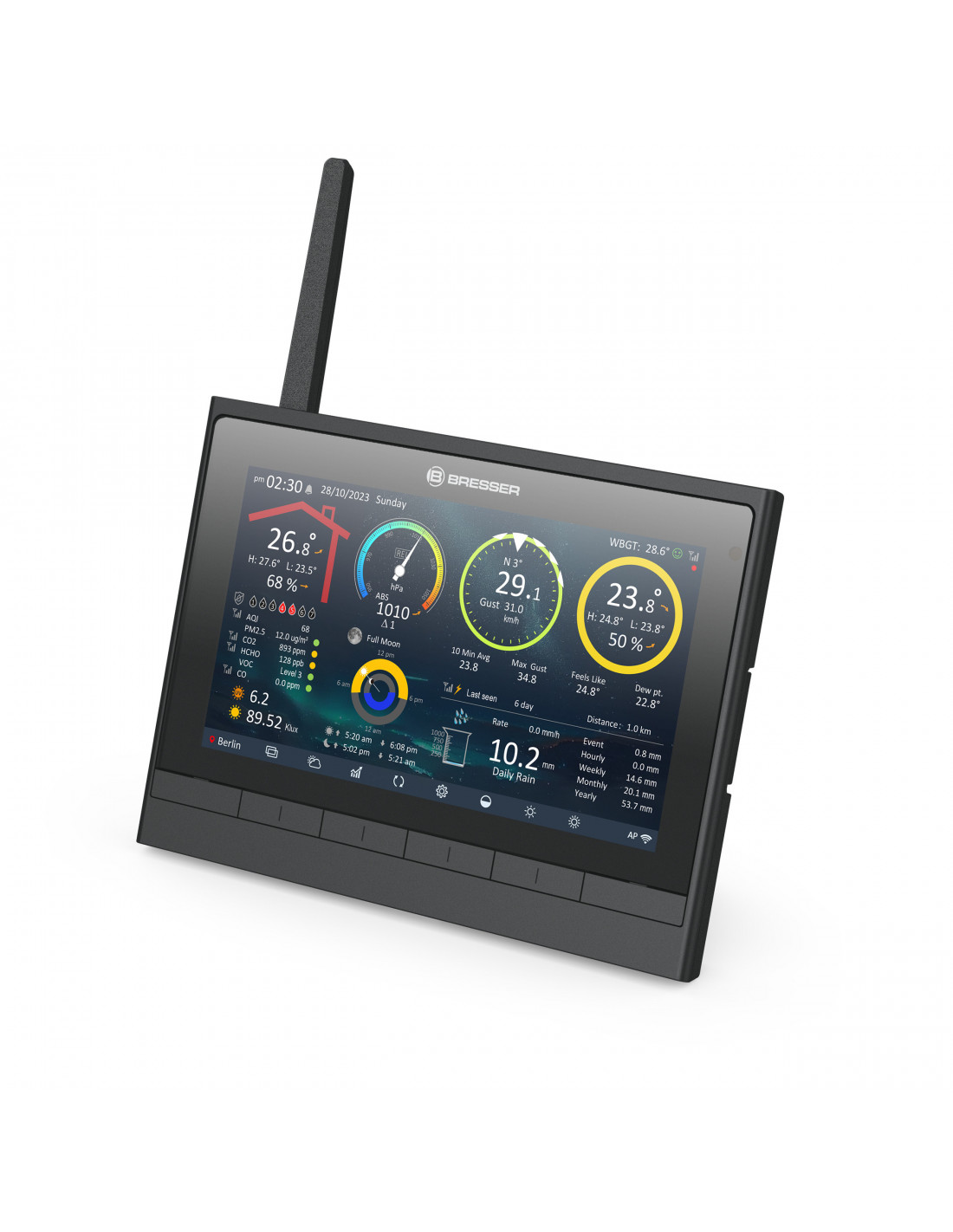 _x000D_ How clean is the air you breathe? The local AQI (Air Quality Index) shows you directly whether the air in your surroundings is clean. Also, current data on pollutant exposure from PM2.5, PM10, NO2, SO2, O3, and CO from the internet are available at the press of a button. For data measured directly on-site, you can expand your weather station with optional CO2 sensors (not included), in addition to optional thermo-hygro sensors (not included) or water detectors (not included).