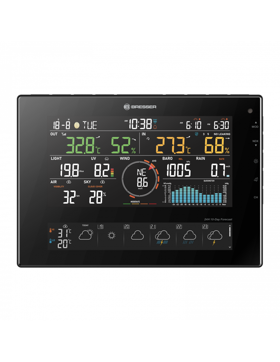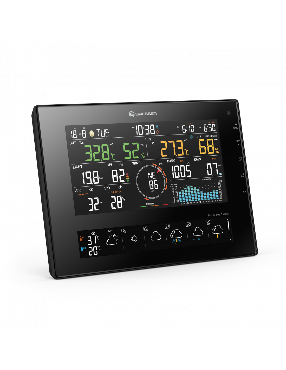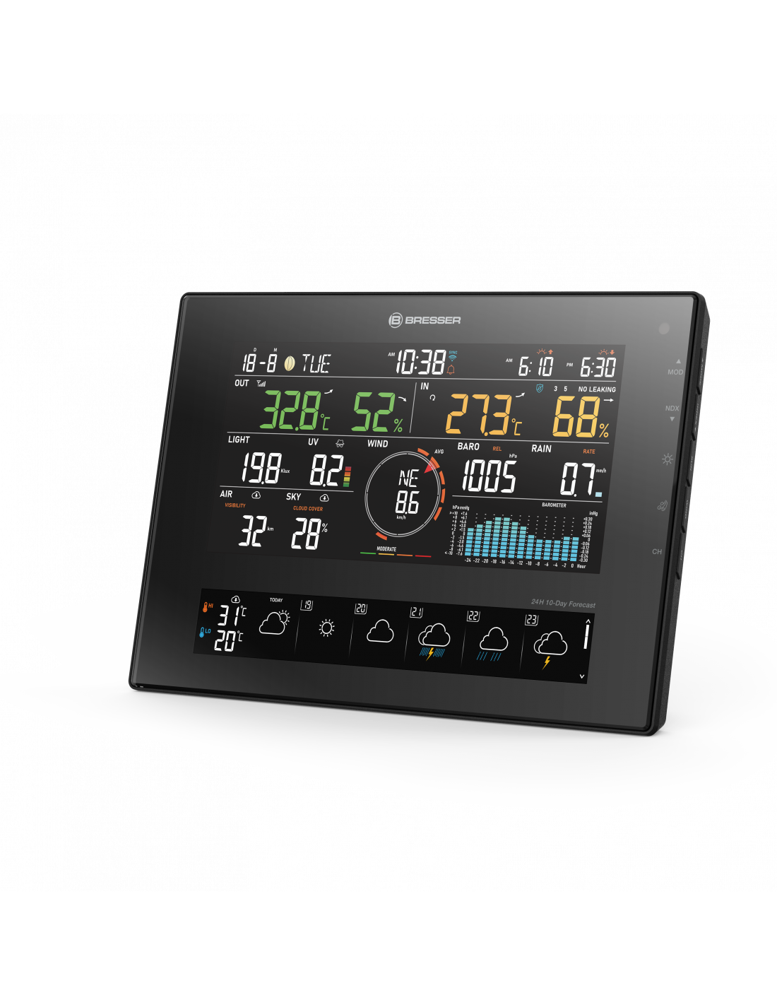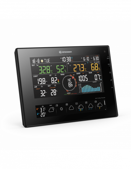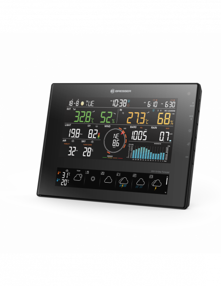 With the BRESSER 11-Day 4Cast CV WiFi Weather Station 7-in-1 you’ll never find yourself left out in the cold by the weather again. The weather station, with 7-in-1 solar outdoor sensor, supplements the on-site data with plenty of practical information from the ProWeatherLive platform. A special highlight: the extensive weather forecast, with the outlook for the next 11 days and a detailed overview of the next 24 hours. Information on local visibility and cloud cover also helps passionate amateur meteorologists to keep a close eye on the weather. You’ll always be up to date, whenever and wherever you are – choose to view your data, incl. max./min. values, conveniently on the clear display of the weather station, in the ProWeatherLive app or in a web browser.