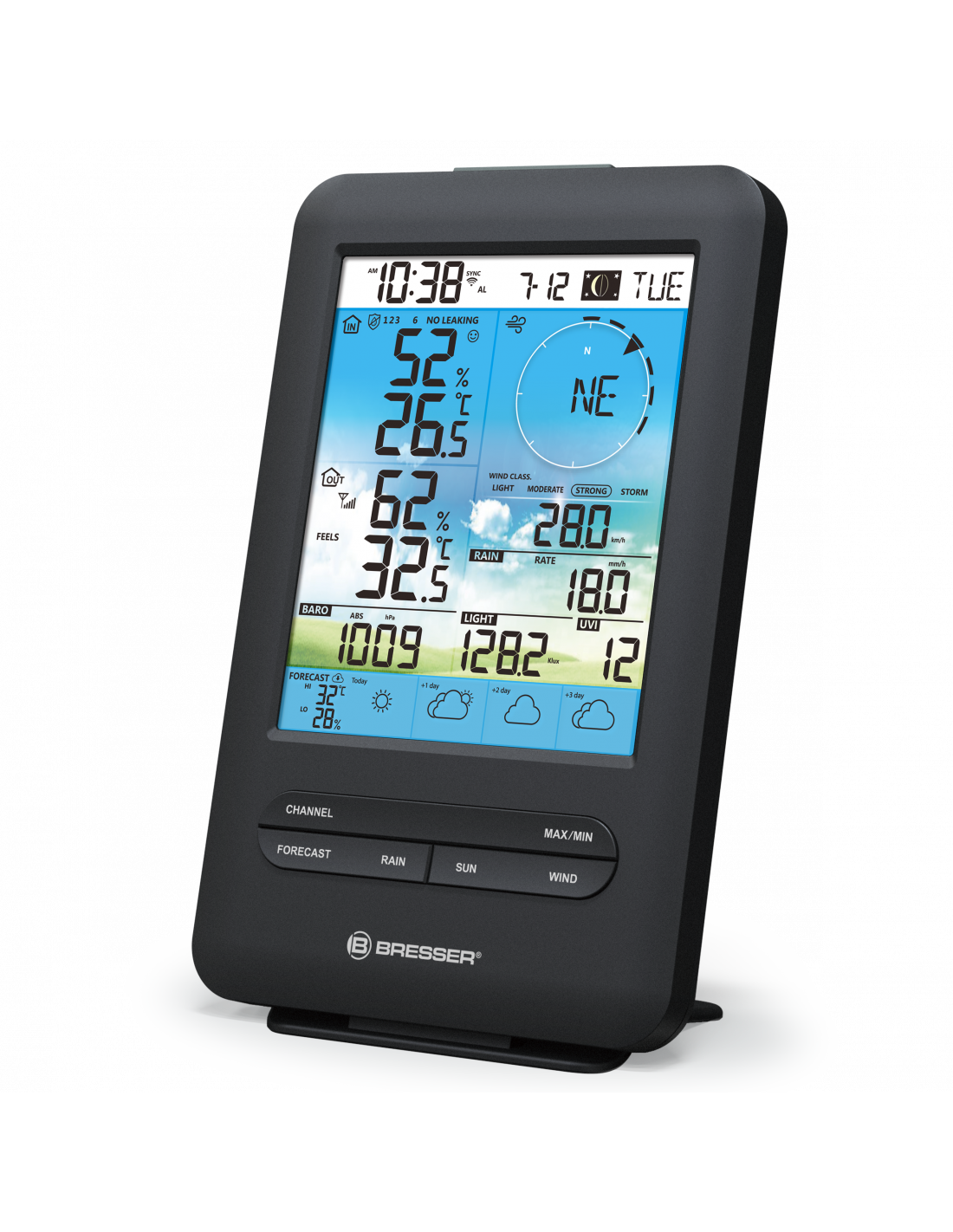 This additional base station allows you to view the weather data from your BRESSER 4-day 4CAST Wi-Fi weather centre in an additional room. It features a stylish colour display, which shows the readings from your 7-in-1 sensor (not included) as well as data from the ProWeatherLife platform. For example, you can place the additional base station in your bedroom to view the measurements for outdoor temperature, humidity, wind speed, wind direction, rainfall, UV level and light intensity as well as the 4-day weather forecast with maximum/minimum temperature and probability of rain – perfect for helping you to choose the right outfit before heading out for the day. The additional base station also displays a range of other useful data, including the perceived temperature, sunburn time, Beaufort level and historical data.