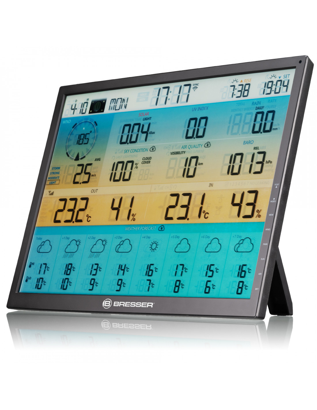 The ultimate weather setup – this additional base station for your existing BRESSER 8-day 4CAST XL Wi-Fi Weather Station gives you access to all your weather station on an additional extra-large 48.3 cm (19”) wide-angle colour display. The chic screen is especially useful in large rooms such as offices, restaurants and shops, and displays all your weather data: simply connect the additional base station to your 7-in-1 solar-powered outdoor sensor (not included) to view the local readings for temperature, humidity, wind speed, wind direction, precipitation, UV level and light intensity.