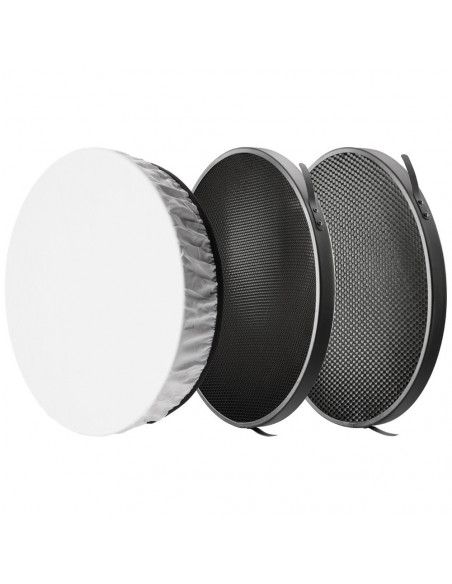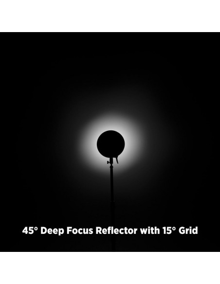 Full control This Westcott 45 Degree Deep Focus Reflector with Honeycomb Grids & Diffusion (Bowens Mount) creates a controlled 45 degree beam for photography and video at long distances. It concentrates light at a narrow 45 degree beam angle while eliminating light spill and lens flare for accurate exposure. Highlights Durable, all metal reflector and grids For the FJ400 flash and other lights with Bowens S type mounts Creates a controlled 45° beam of light Snap in honeycomb diffusers 27 cm diameter reflector with standard Bowens S type Honeycomb grid and diffuser The included snap in 15 and 30 degree honeycomb diffusers offer even more light control for accurately focusing light on your subject or scene. These grids allow you to selectively illuminate areas of your subject. The size of the projected light circle depends on the selected grid and the distance to your subject. Uncompromising light control Honeycomb grids consist of cells that direct light off axis in 6 directions. By focusing light through a grid, you simultaneously eliminate light waste and lens flare for accurate exposure. Versatile modifiers This durable, all metal accessory set features an S type Bowens mount. It is compatible with any Bowens mount light, including the popular Westcott FJ400 flash., Durable, all metal reflector and grids For the FJ400 flash and other lights with Bowens S type mounts Creates a controlled 45° light beam Snap in honeycomb grids 27 cm diameter reflector with standard Bowens S type Compatibility: Godox/Bowens Grid angle: 15°, 30° Dimensions: 13.6 à 11.0 à 11.0 in. (34.5 à 28.0 à 28.0 cm) Weight: 1.0 kg. , 1 à Westcott 45 Degree Deep Focus Reflector 1 à 1 stops diffusion cloth for 45 degree deep focus reflector 1 à 15 degree honeycomb grid 1 à 30 degree honeycomb grid